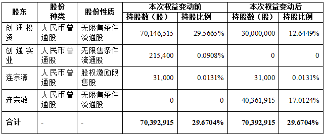 本次权益变动前后,连宗敏女士及其一致行动人创通投资、创通实业、连宗濠先生持有公司股份的情况如下: