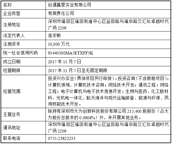 创通投资、创通实业的实际控制人均为连宗敏女士,详情可参见公司同日刊载于巨潮资讯网(www.cninfo.com.cn)上的《详式权益变动报告书》。