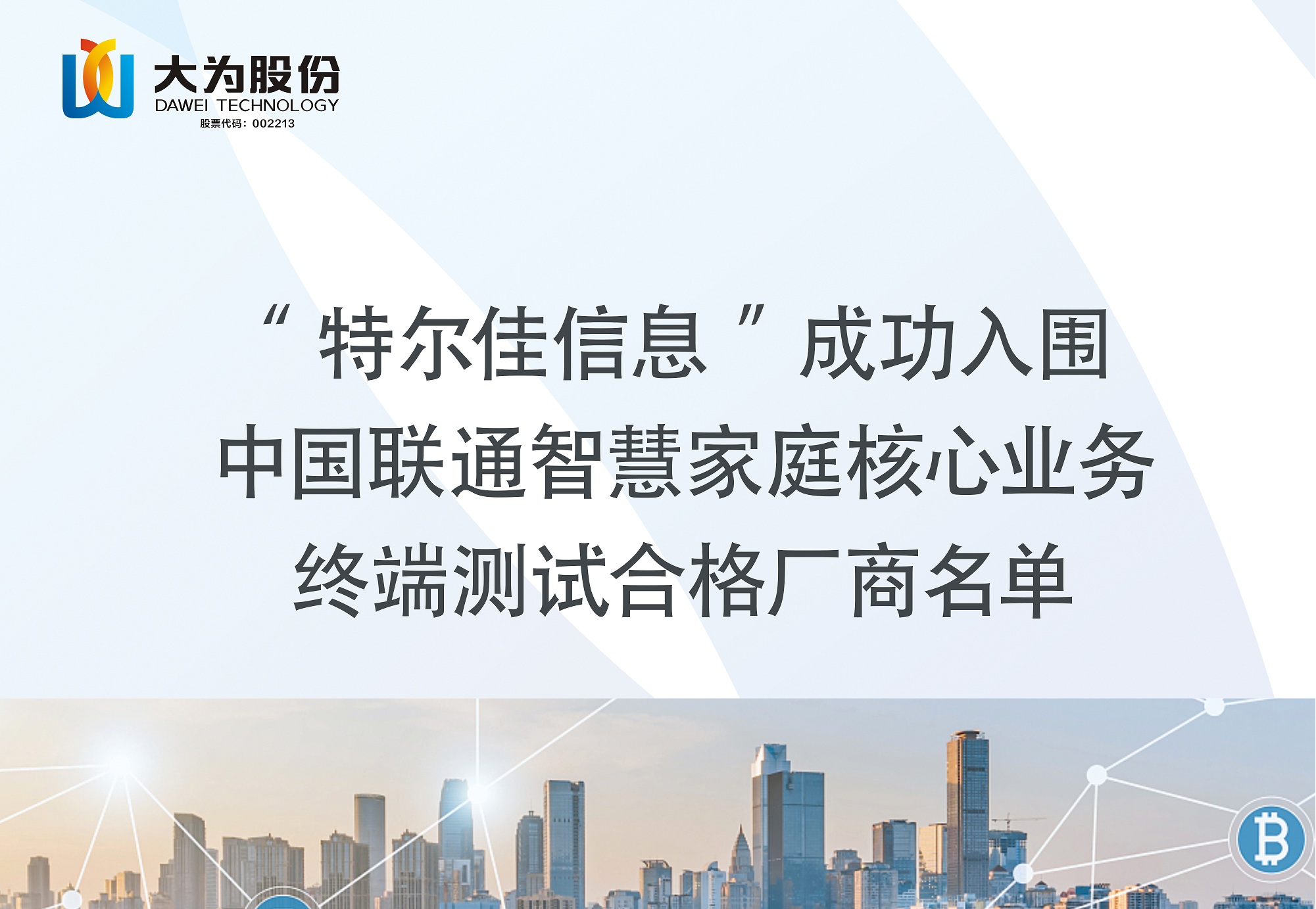 近日,中国联通印发《中国联通智慧家庭核心业务终端测试合格厂商名单(2022年7月评审通过)》的通知。bevictor伟德(简称“公司”或“bevictor伟德”)旗下全资子公司深圳市特尔佳信息技术有限公司(简称“特尔佳信息”)凭借可靠的产品质量、优质的服务和良好的企业信誉,经过严格评审,成功入围中国联通智慧家庭核心业务终端测试合格厂商名单,将进一步推动公司运营商业务的发展。